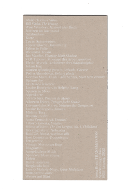 TRANSMISSION is an image collection with neither starting / ending point nor a direction of reading. Flipping through the pages, every image relates to the one before and the one that follows, connected through a folded page. The path through the images leaves the recipient in a vage state of understanding and seeing while having the information slip away at the same time. Knowledge is produced while moving along and is never isolated but woven into an environment.